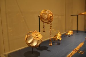 The gold jewelry on display in this exhibition shone like the sun among the marble sculptures surrounding it. The Greeks, who had previously spurned ostentatious display of wealth through jewelry, came into contact with kingdoms in the ancient Near East and began to embrace the art through the production of jewels like those in the exhibition. See the minute attention to detail displayed in the pieces below.