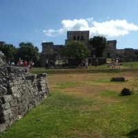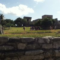 Once your eyes have adjusted to the city across the field you’re standing in, you move toward the buildings with an increasing sense of awe. Tulum is a small city clustered on a green plateau atop the cliff but cleverly designed so that one always has a sense of open space. In its time there were over 1,000 people living here but the diseases brought by the Spanish invaders devastated the community which resulted in its abandonment.