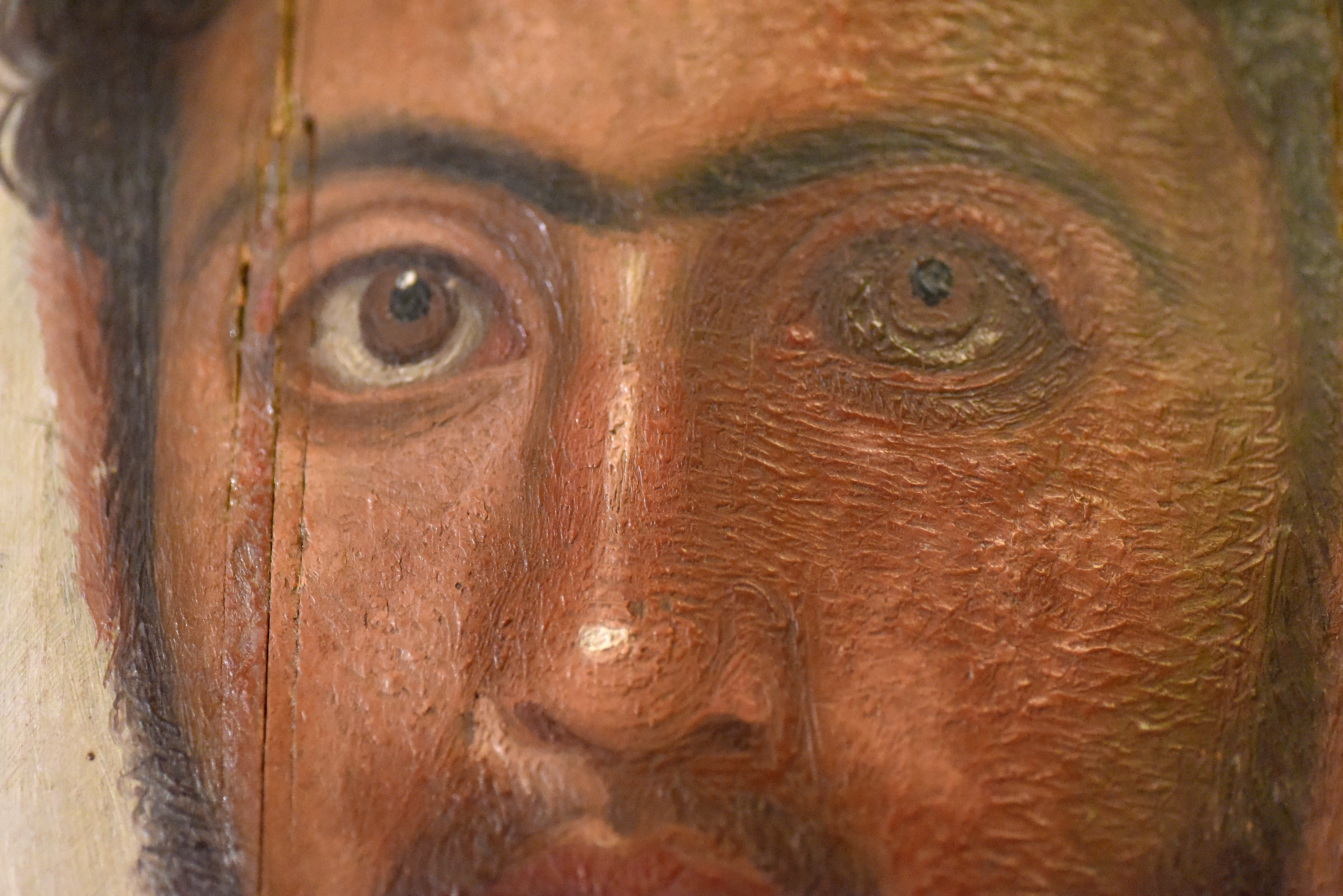 Detail of a mummy portrait from Hawara. This is a thin lime (Tilia species) wooden panel with encaustic wax mummy portrait. of Petrie’s “red youth”. The man has curly light beard and moustache. It appears that a sharp tool was used to delineate the shape of the face, ears, and eyebrows. From Hawara cemetery, Egypt. 1st to 2nd centuries CE. The Petrie Museum of Egyptian Archaeology, London (with thanks to The Petrie Museum of Egyptian Archaeology, UCL).